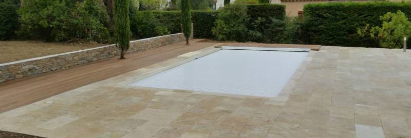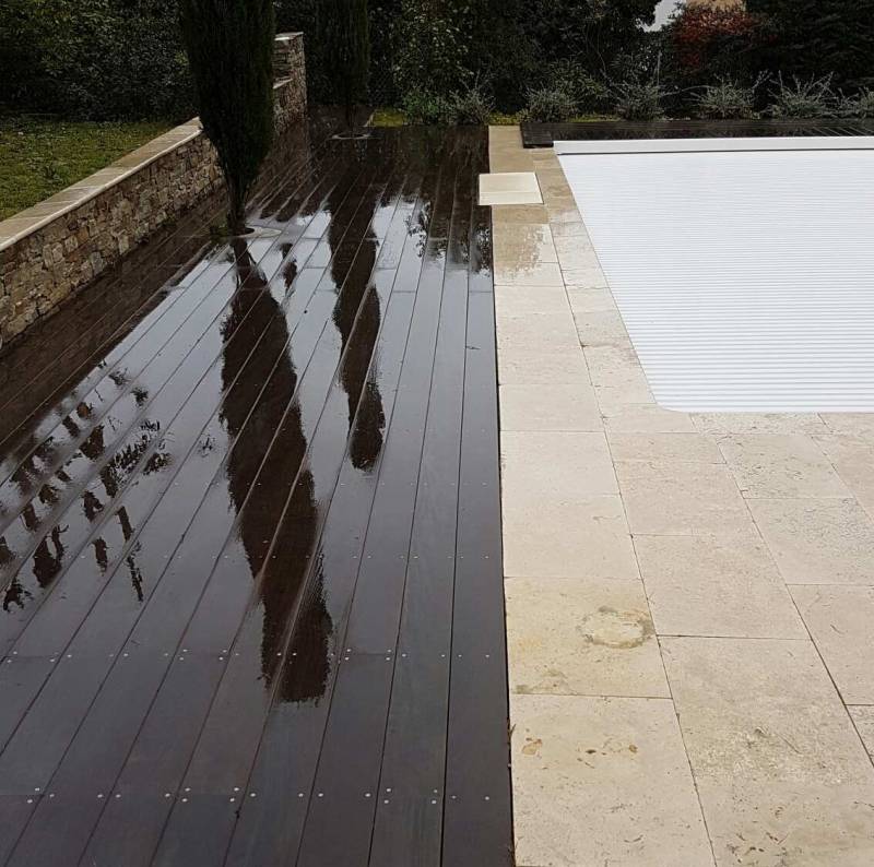 Sur les photos, vous pouvez voir une plage en bois( IPE) réalisé contre une plage en travertin,sur des murets de soutènements habillés en pierre de placage.