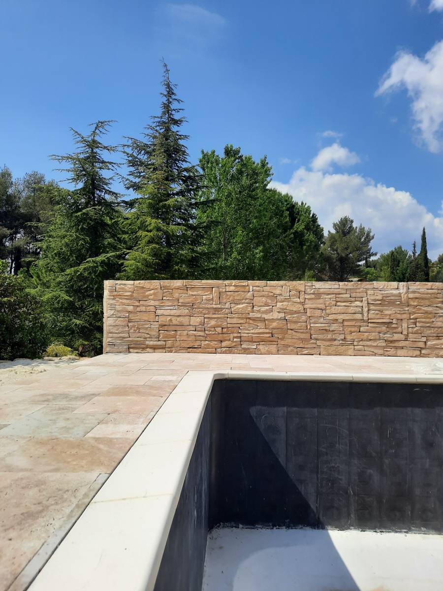 Pour cette réalisation varoise, le choix c'est porté sur des plages en pierre naturelle ainsi que des murs recouvert de placage.