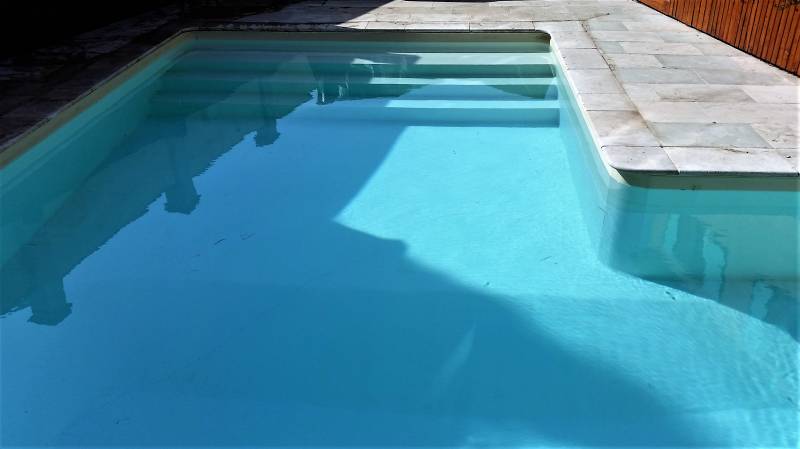 La couleur sable du liner donne une couleur lagon à cette piscine.