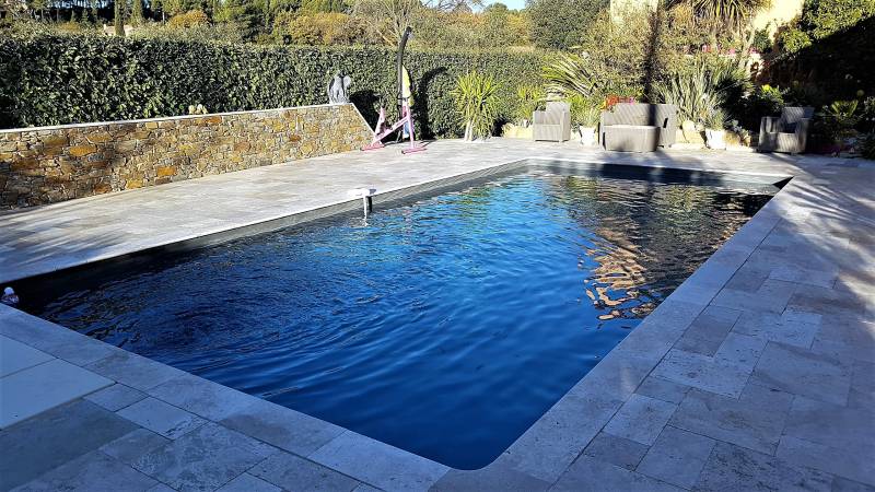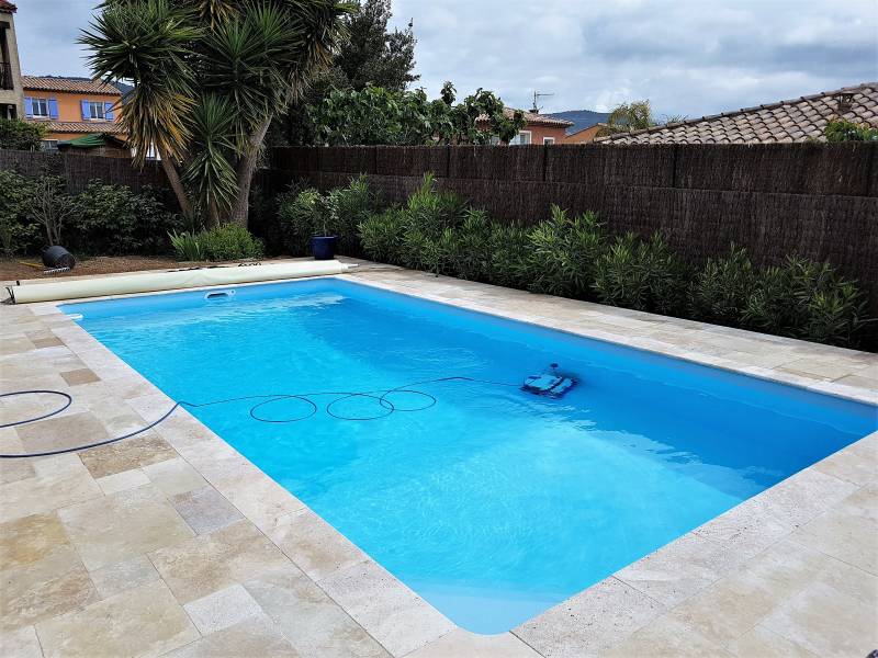 Peux importe la couleur du bassin(bleu, blanc ,sable ,gris foncé ou clair..) ,Le travertin