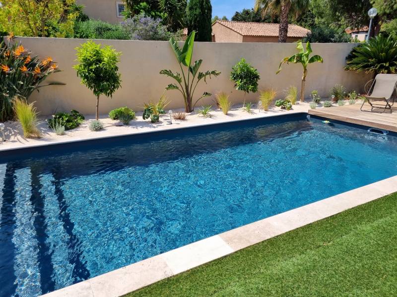 C'est une piscine mesurant 7 mètres par 3.50 .elle en béton avec un liner gris anthracite pour garantir l'étanchéité. Les escaliers ont une plages de 0.60 mètres sur la largeur.